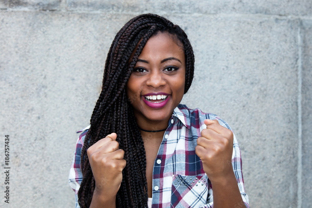 Fotografie Cheering african woman looking at camera