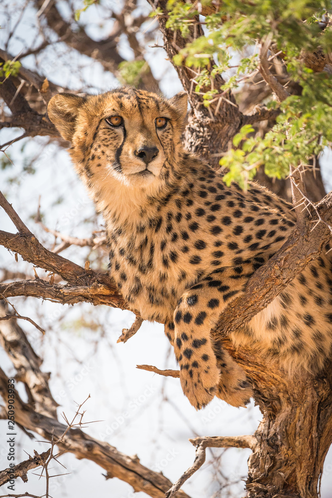 Fotografie Cheetah in a tree (Acinonyx jubatus)