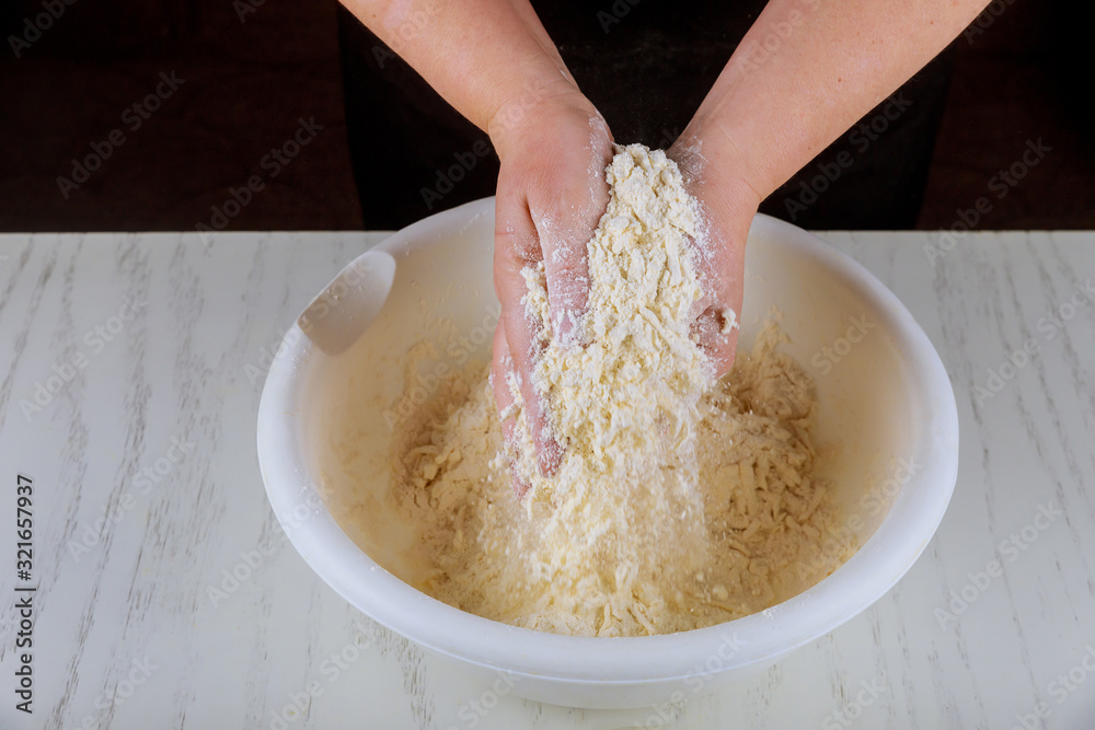 Fotografie Chef kneading flour, sugar and butter with hands.