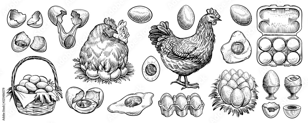 Fotografie Chicken eggs and farm hen hand drawn vector