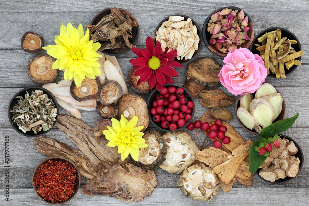 Obraz na plátně Chinese herbs and flowers in bowls and loose used in traditional herbal medicine on rustic wood background