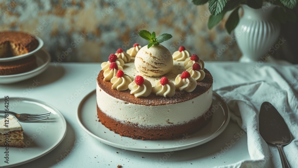 Fotografie Chocolate cake with whipped cream frosting and raspberries on a white table with a slice and fork next to it