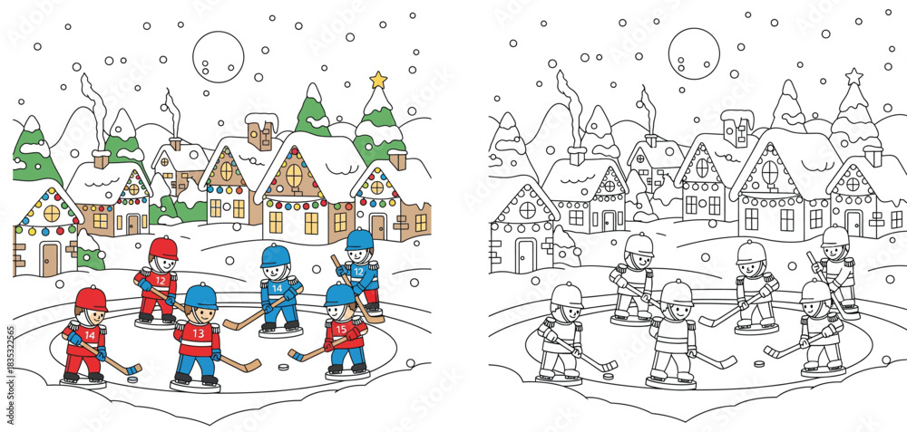Fotografie Christmas coloring book page for kids with hockey players in winter village and