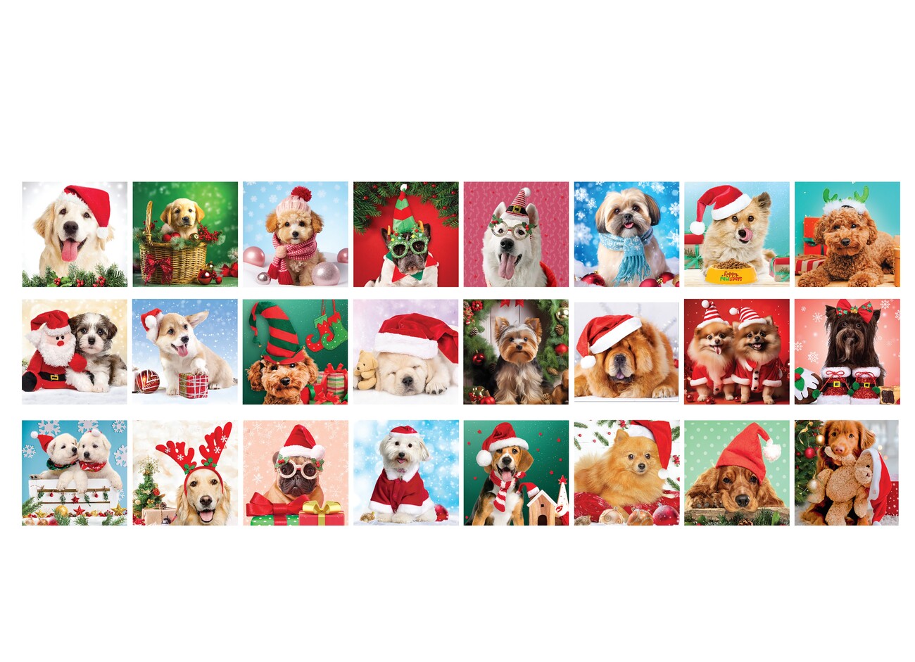 Psí parťáci v rolích svátečních pomocníků. V kalendáři je ukryto 24 mini puzzlů se svátečně naladěnými psy. Každý den se otevře jedna přihrádka a na řadu přijde samostatný obrázek o 50 dílcích. Přesné výseky zajistí, že se obrázky budou skládat téměř samy. Legrační hafaní obrázky zkrátí čekání na Štědrý den.