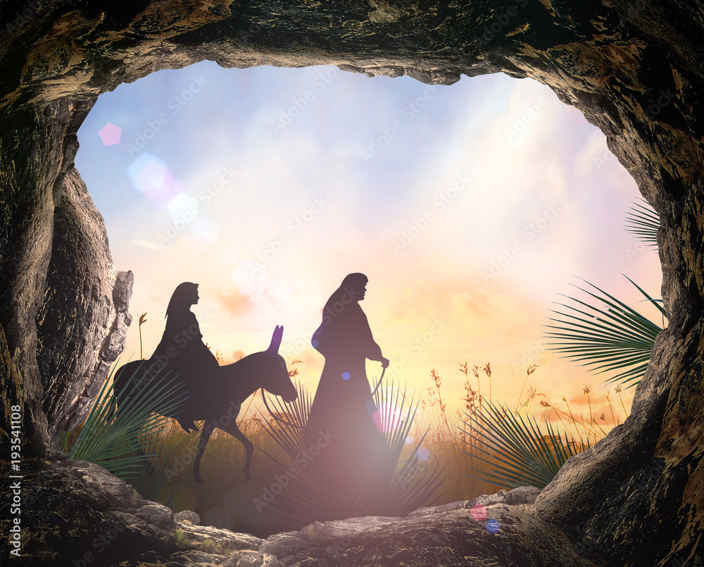 Fotografie Christmas religious nativity concept: Silhouette mother Mary and father Joseph l