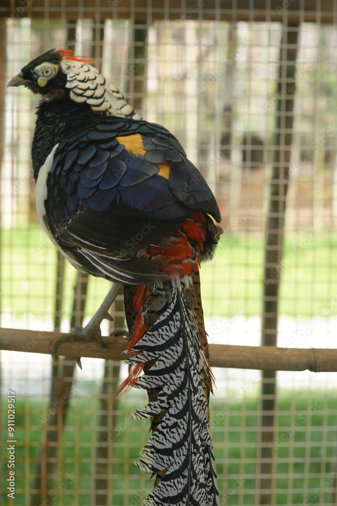 Fotografie Chrysolophus amherstiae, commonly known as Lady Amherst's Pheasant, is a bird species known for its striking appearance and vibrant plumage