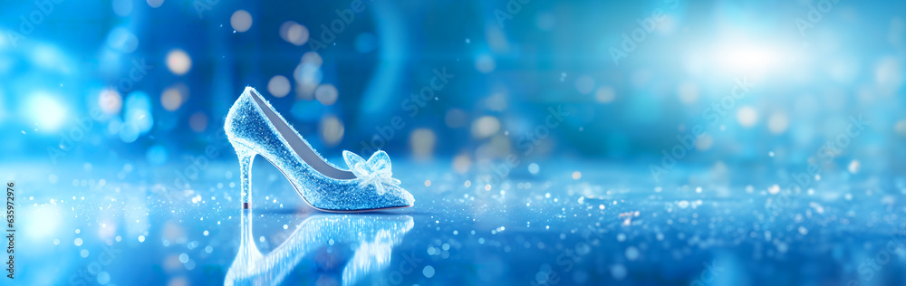 Fotografie Cinderella crystal slipper on blue Abstract Defocused background