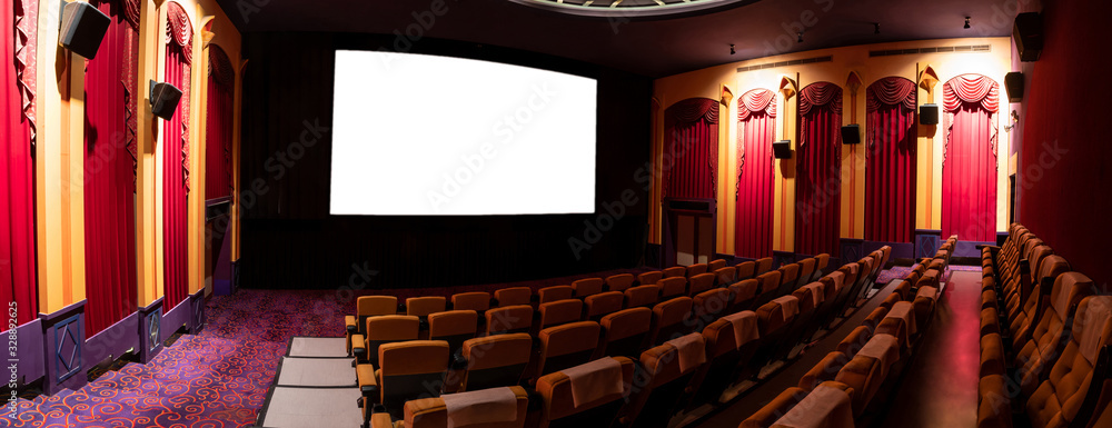 Fotografie Cinema theater screen in front of seat rows in movie theater showing white screen projected from cinematograph