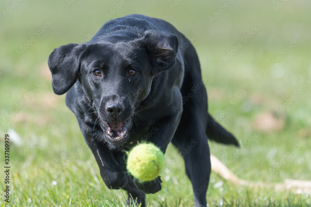 Fotografie Close up of a black Labrador puppy chasing a tenis ball in mid air