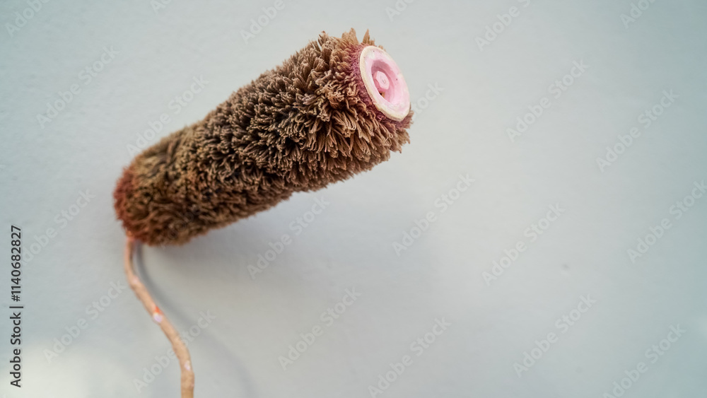 Obraz na plátně Close-up of a used paint roller against a white wall