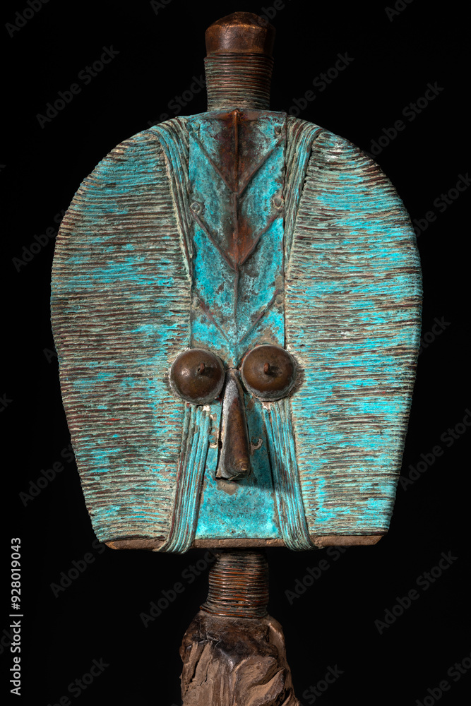 Fotografie Close up of a wooden Kota reliquary figure from Gabon, isolated on a black background