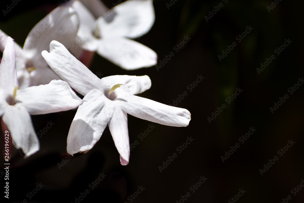 Fotografie Close up of fragrant white Jasmine flowers; dark background