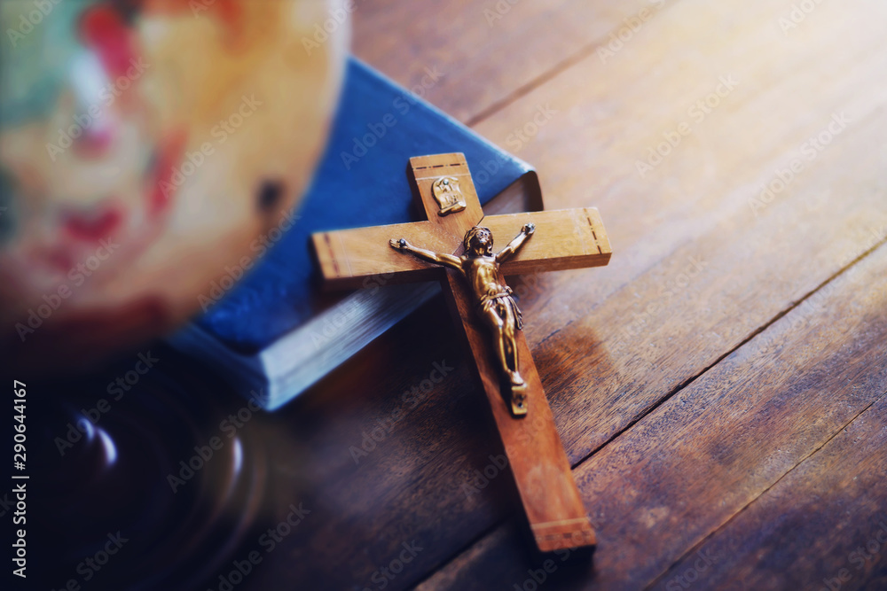 Fotografie Close up of Jesus's crucifix over bible with blurred world globe on wooden table