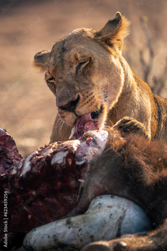 Obraz na plátně Close-up of lioness feeding on buffalo carcase