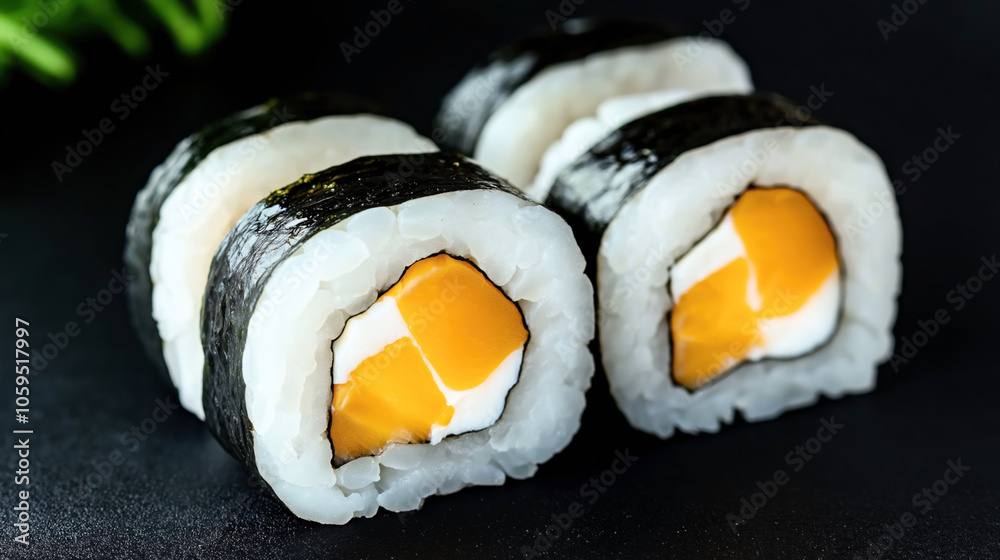 Fotografie Close-up of sushi rolls with rice, cream cheese, and mango wrapped in nori on a