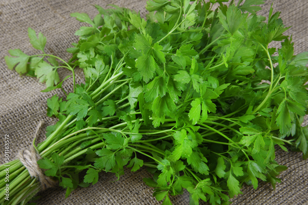 Fotografie close up of the parsley bundle on hessian