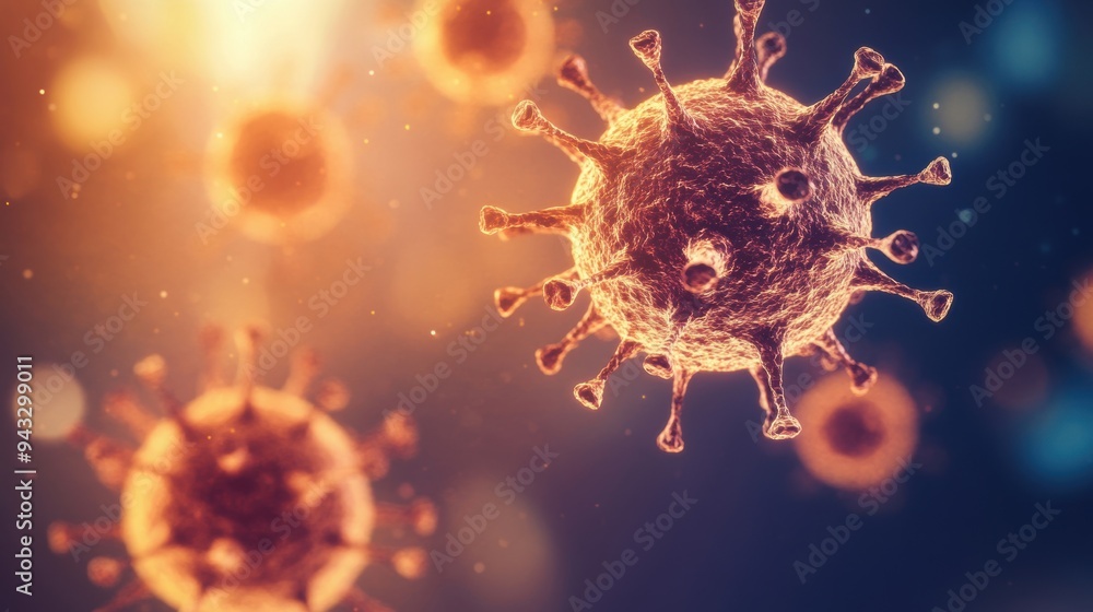 Fotografie Close-up of virus particles under a microscope, with a warm glow, symbolizing infection, disease, and scientific exploration