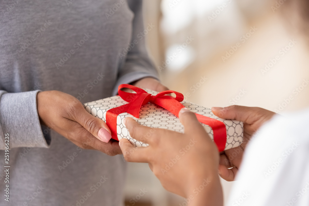 Fotografie Close up of women hands holding one gift box