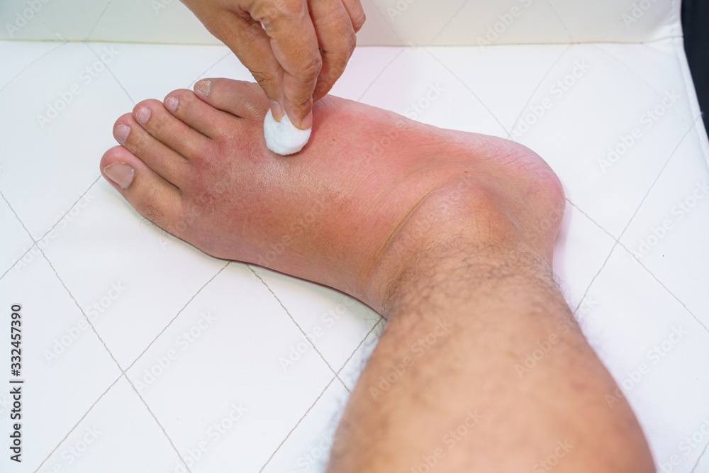 Fotografie Close up old man right foot, Ankle wounded waiting and swelling infectious disease by bee sting allergic reactions nurse treatment on wound dressing a bloody and brine of patient on white background
