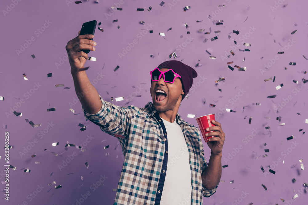 Obraz na plátně Close up photo portrait of screaming carefree handsome positive with red plastic