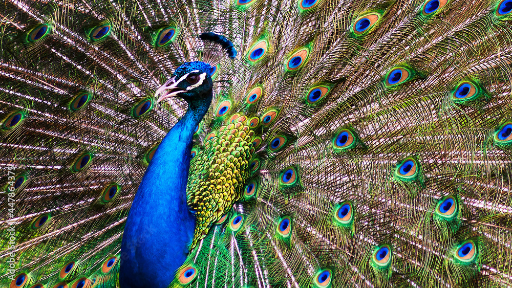 Fotografie close up portrait of a male peacock with colorful feathers on full display