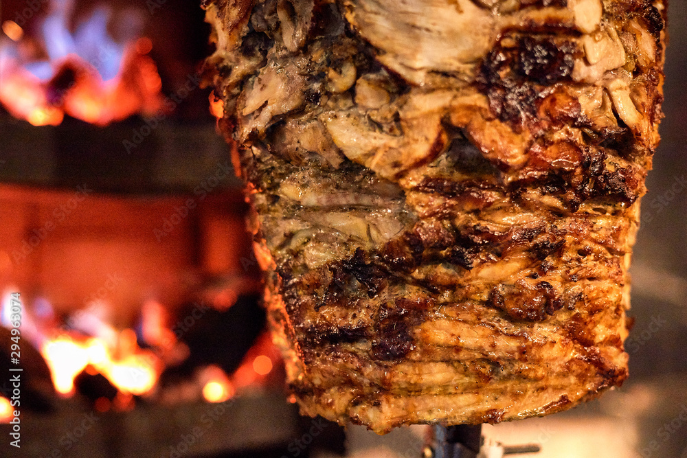 Fotografie Close up shot of stacked meat roasting to be used in preparation of traditional Greek dish gyros or Turkish durum doner