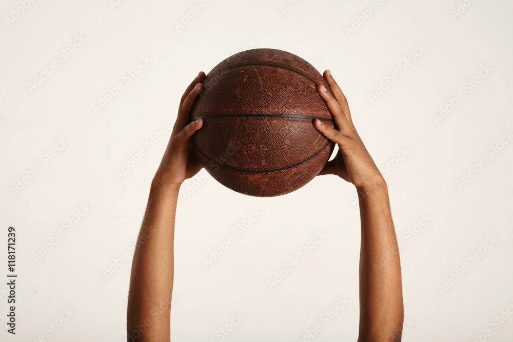 Fotografie Close up shot of two strong dark-skinned hands holding up an old vintage leather