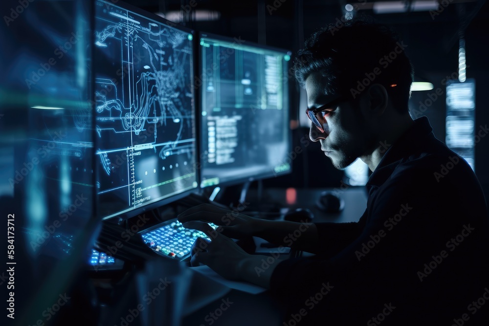 Fotografie close-up view of a man who works with modern artificial intelligence (AI) technology, set in a futuristic style environment