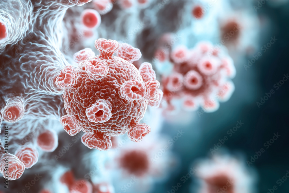 Fotografie Close-up view of a microscopic structure of a virus with spike proteins visible on its surface, highlighting a biological and scientific perspective