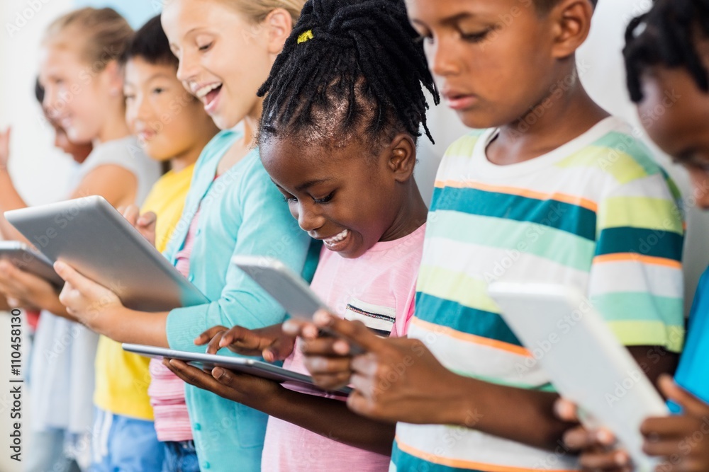 Obraz na plátně Close up view of pupils standing using tablet pc