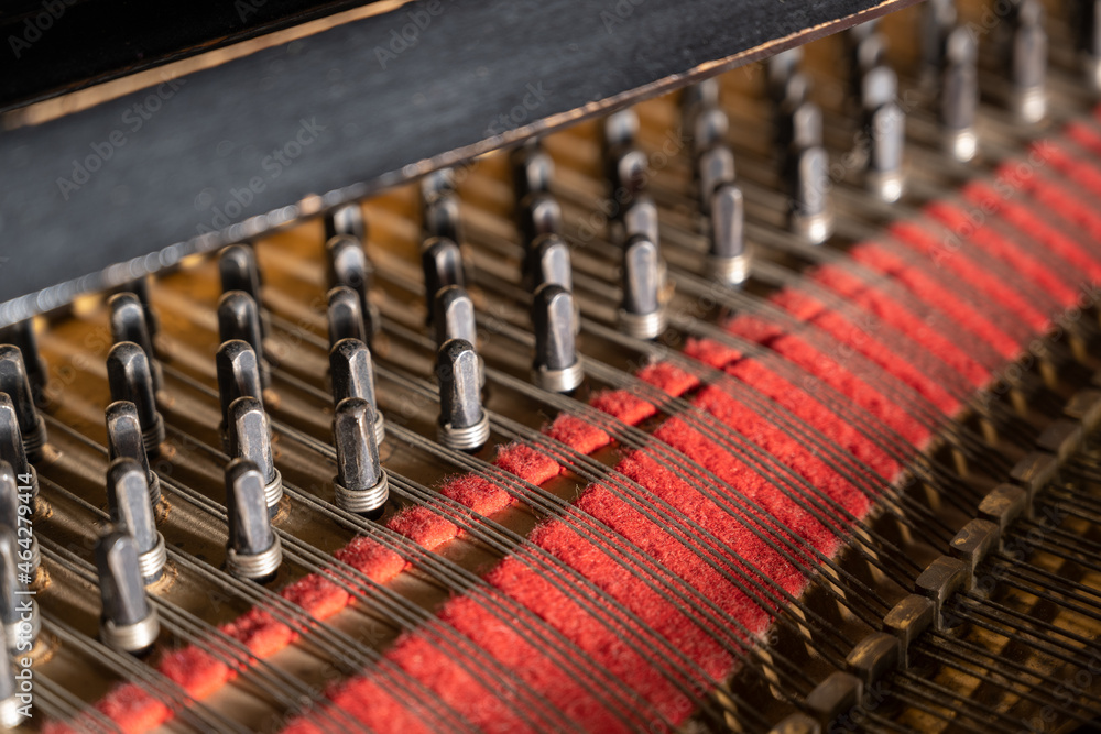 Fotografie Close-up view to pins or pegs with strings and red felt inside an older grand pi