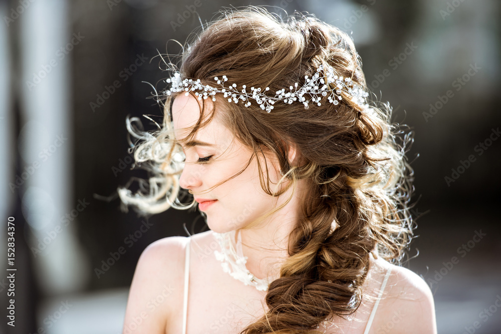 Fotografie Closeup brunette bride with fashion wedding hairstyle and makeup