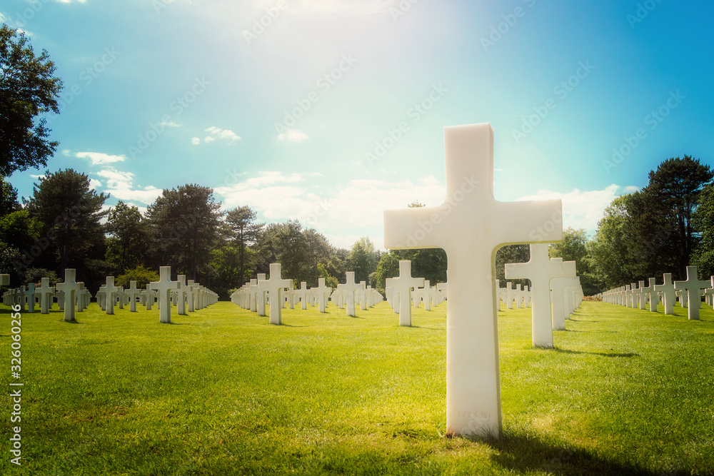 Fotografie Closeup of a white cross military grave in the Normandy American Cemetery on a sunny day, Colleville-sur-Mer, France