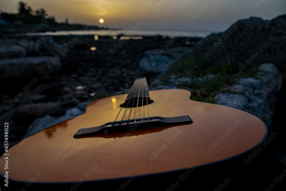 Obraz na plátně Closeup shot of a brown wooden guitar on the rocks at the seaside during late su
