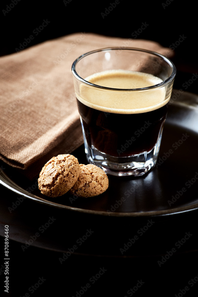 Fotografie Coffee in glass cup on dark background. Close up. Copy space.