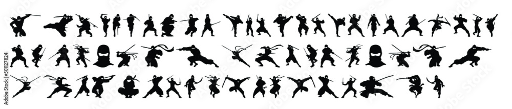 Fotografie Collection of ninja silhouette vectors on a white background