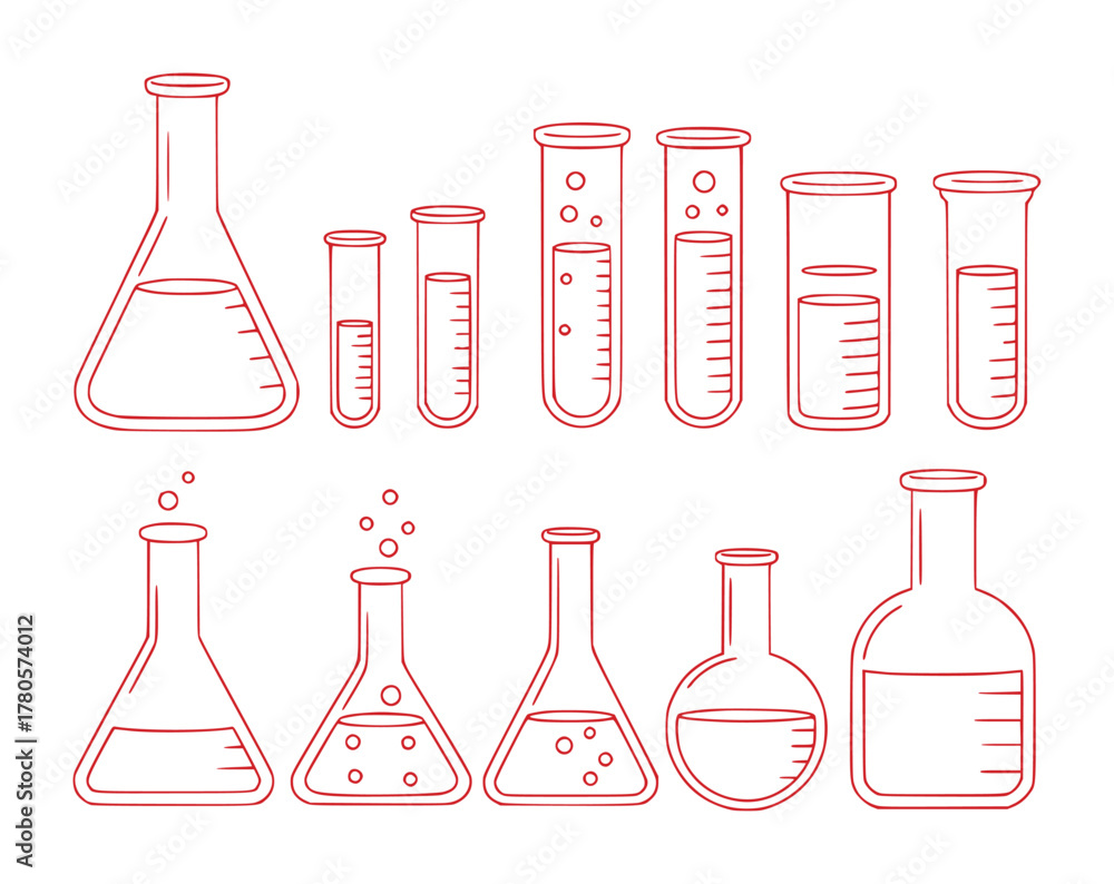 Fotografie Collection of Red Line Art Laboratory Glassware and Test Tubes