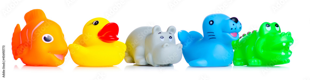 Fotografie Colorful rubber baby bath toys on white background isolation