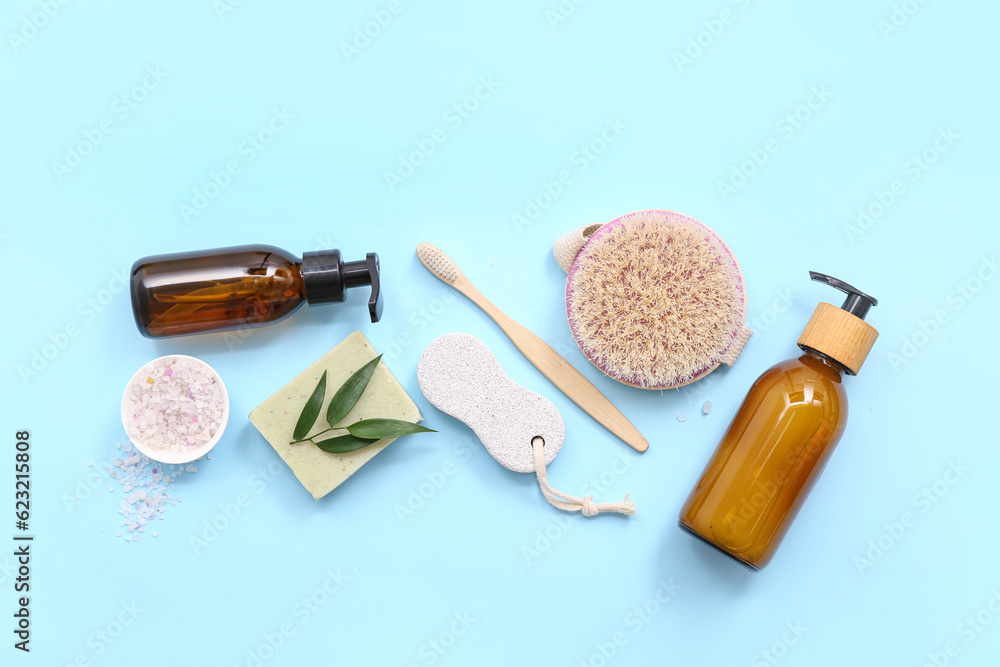 Fotografie Composition with bath accessories and bottles of cosmetic products on color back