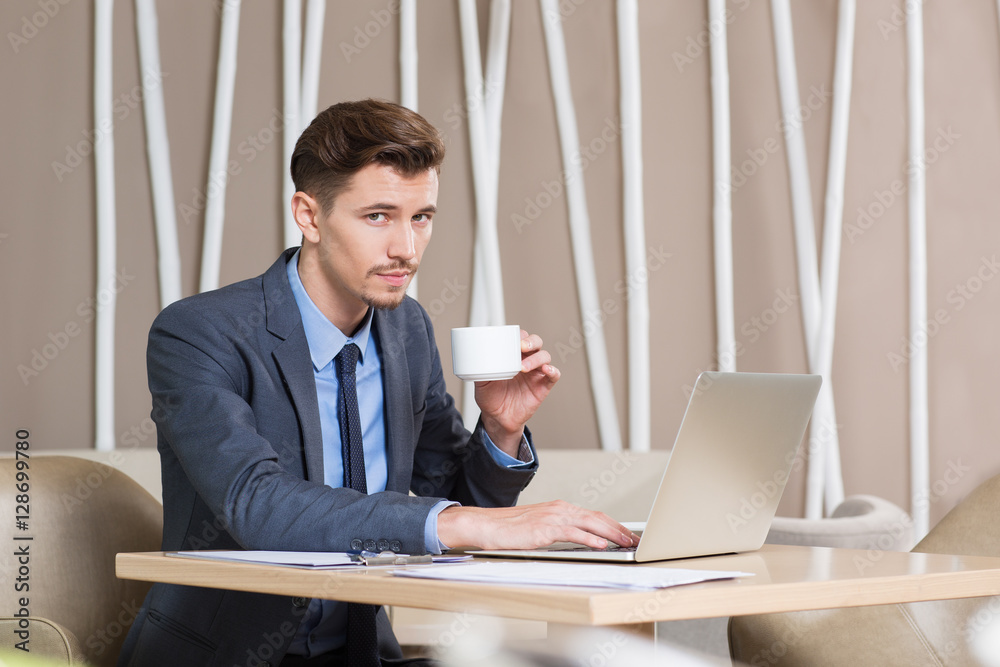 Fotografie Confident Man Drinking Coffee and Working in Cafe