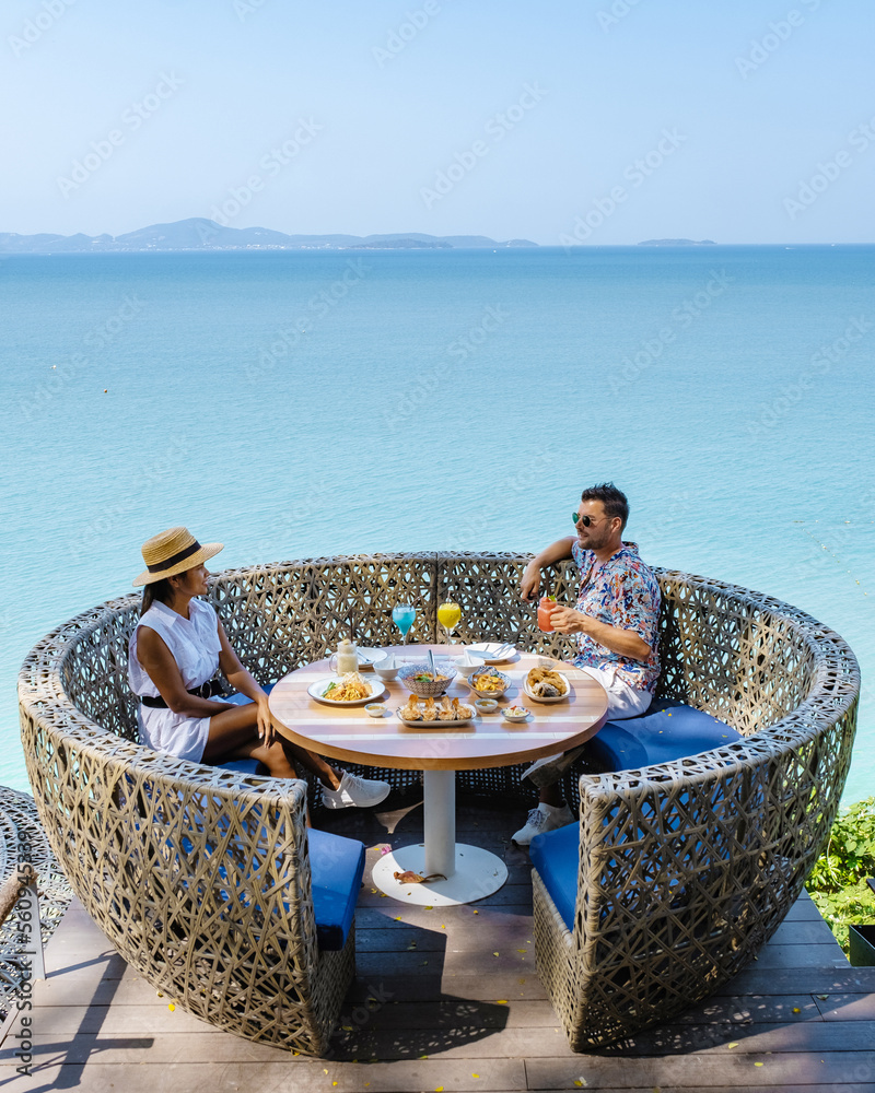 Fotografie couple having lunch at a restaurant looking out over the ocean of Pattaya Thailand, man and woman having dinner in a restaurant by the ocean in Pattaya