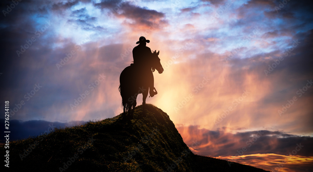 Fotografie cowboy riding in the hill at sunset