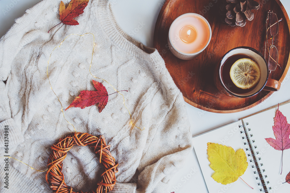 Fotografie cozy autumn table, top view of still life details in hygge style on white background