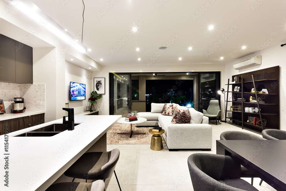 Fotografie Creative living room including kitchen, dinner, shelf and living