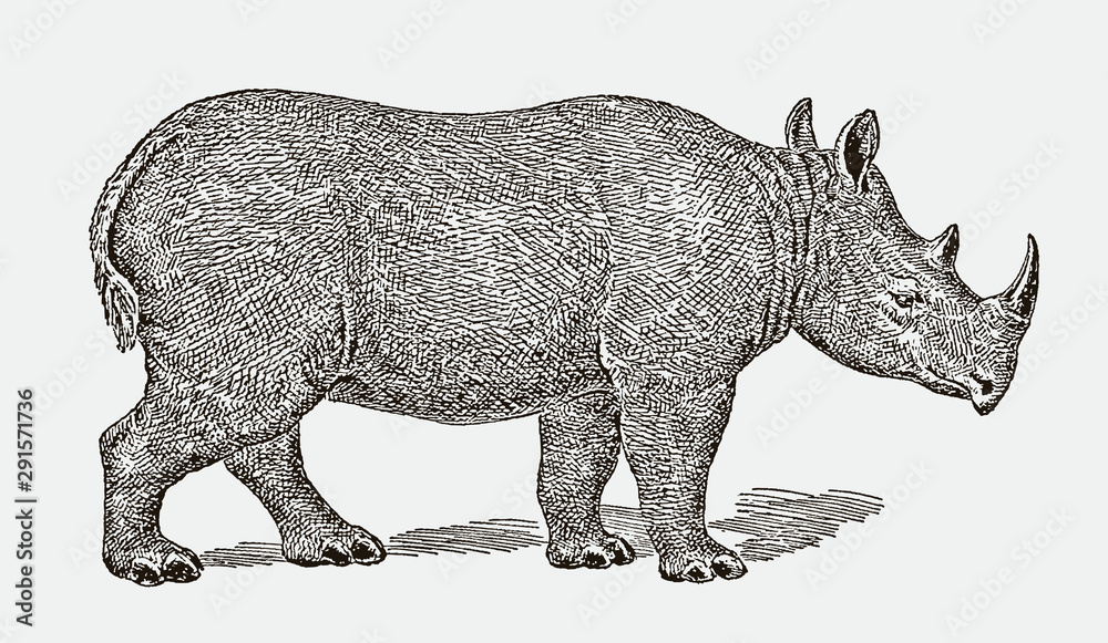 Fotografie Critically endangered black hook-lipped rhinoceros diceros bicornis in side view