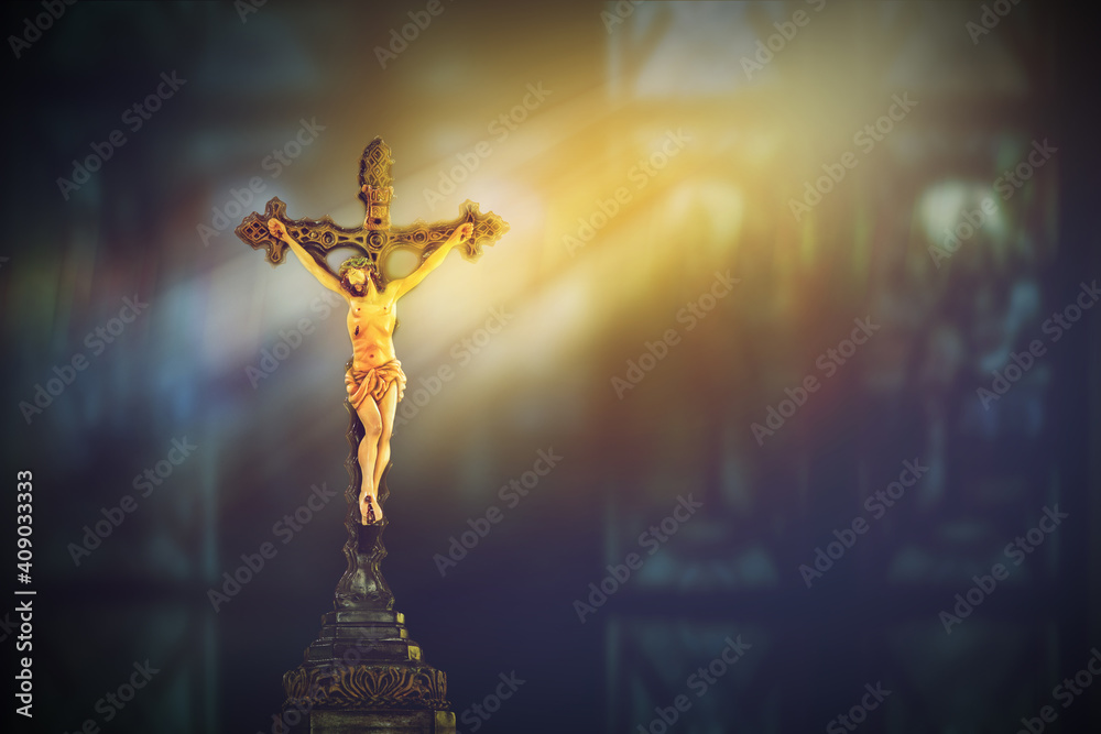 Obraz na plátně crucifix, jesus on the cross in church with ray of light from stained glass