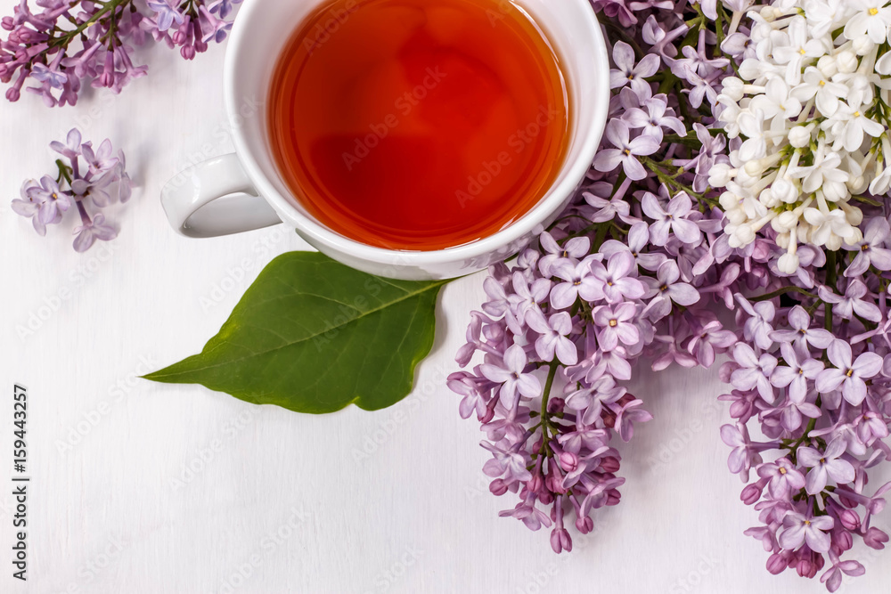 Fotografie Cup of black tea with a bouquet of lilac on a white table