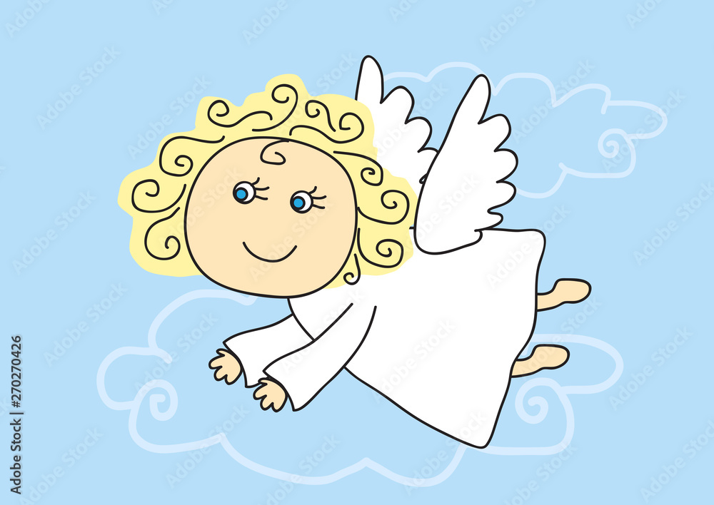 Obraz na plátně Cute angel flies on a blue background. Vector illustration.