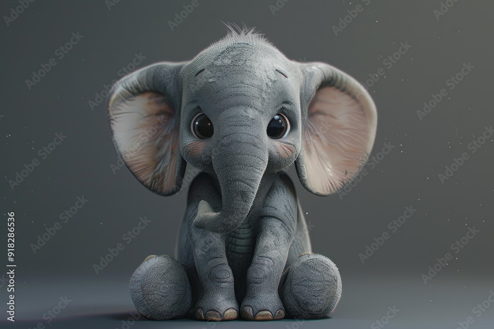 Fotografie Cute animated baby elephant with large eyes and ears sitting against a grey back