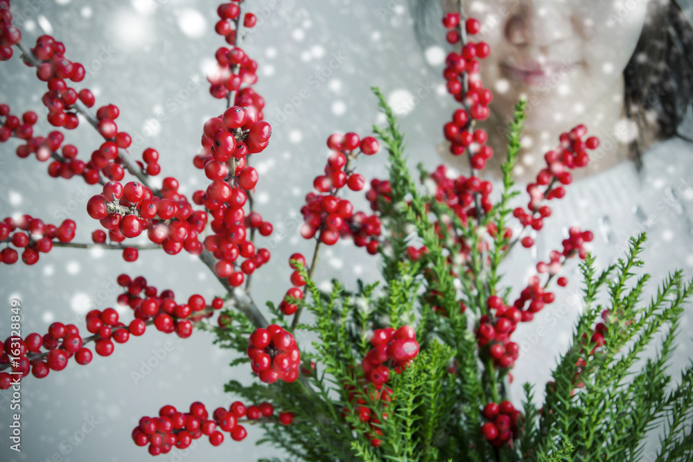 Fotografie Cute asian woman holding ilex verticillata or winterberry with snowing for chris